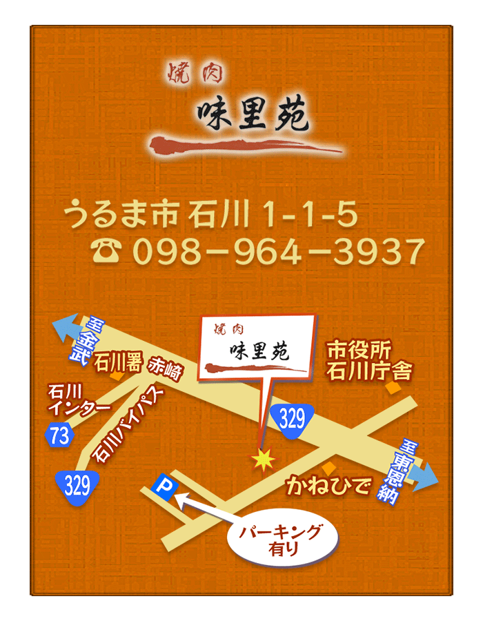 東京の大手焼肉店で修行し40年のキャリアをもつ料理長がもてなすリーズナブルで美味しいお肉が食べれる和牛専門店。焼肉やホルモン、その他サイドメニューも充実。もちろん味には自信があります。 ホルモン盛り(上ミノ・しまちょう・まるちょう・レバー)¥1,200(税込) ユッケジャンスープ ¥780(税込) 和牛上カルビ ¥1,200(税込) 上タン塩 ¥1,100(税込) さくらユッケ ¥800(税込) 営業時間 (月〜土)17:00〜26:00 (日・祝祭)17:00〜24:00 定休日 木曜日 住 所 うるま市石川1-1-5 TEL 098-964-3937
