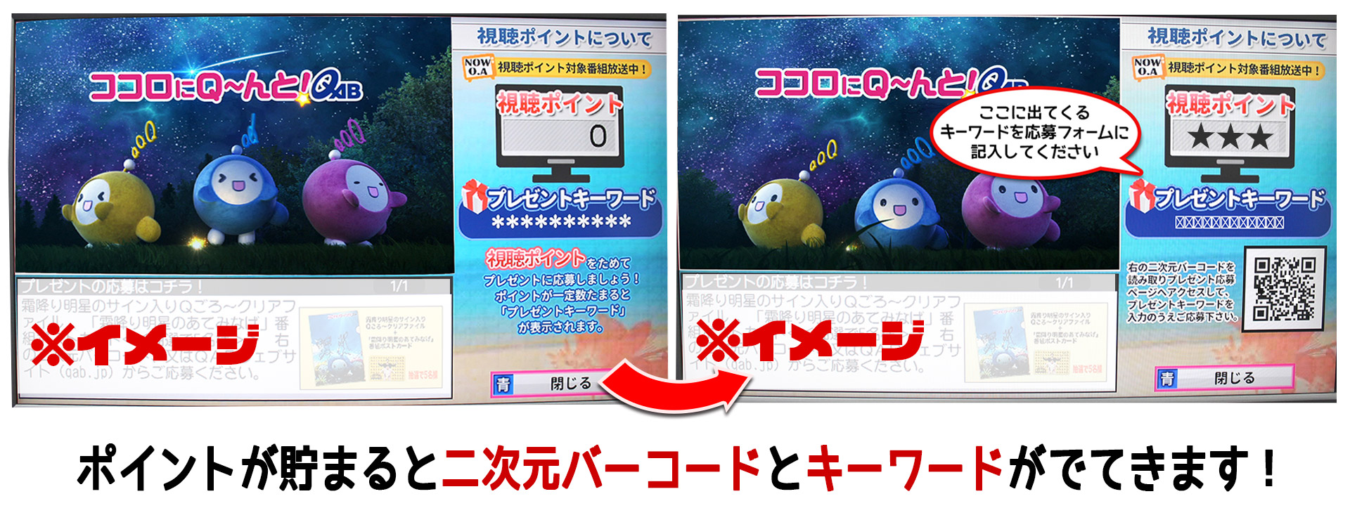 ・応募画面に表示される二次元バーコードをスマートフォンで読み取り、表示されたアドレスにアクセスしてご応募ください。または、QABウェブサイトよりご応募ください。
