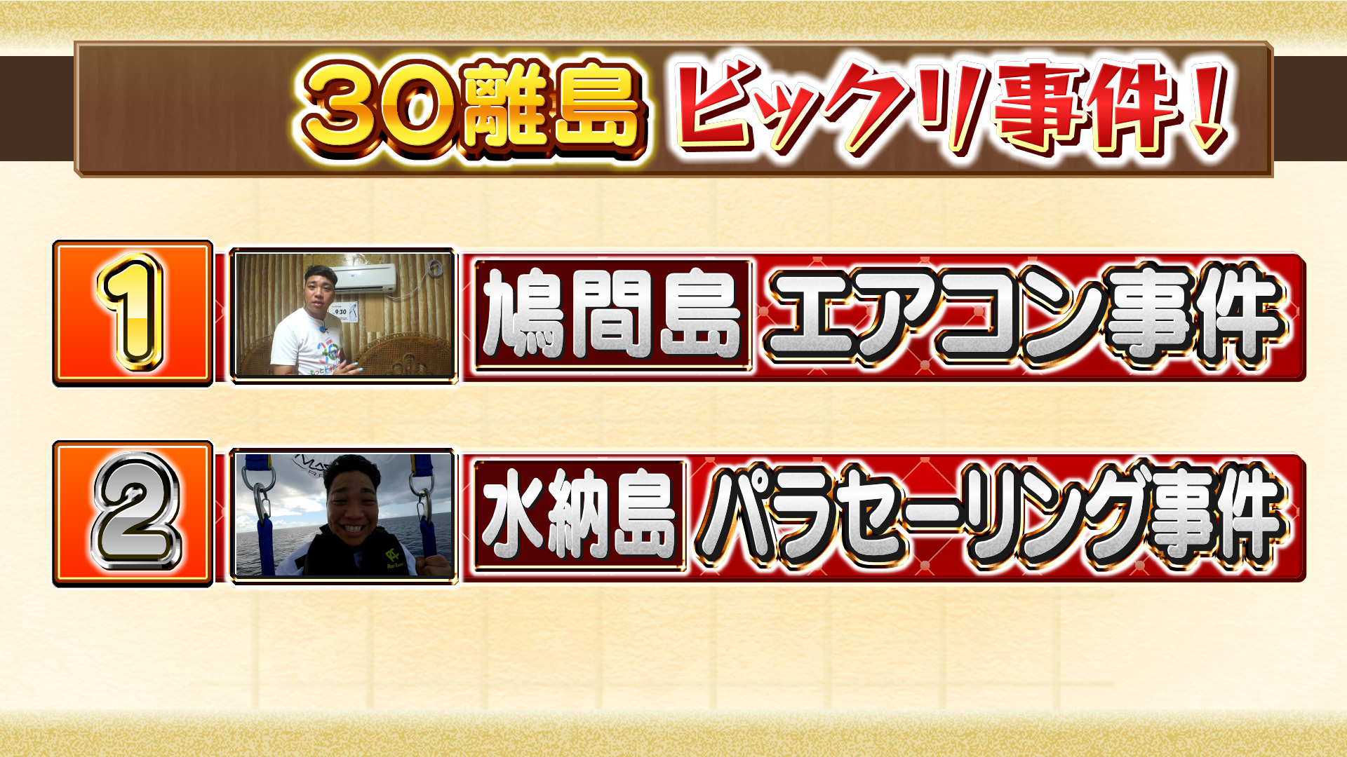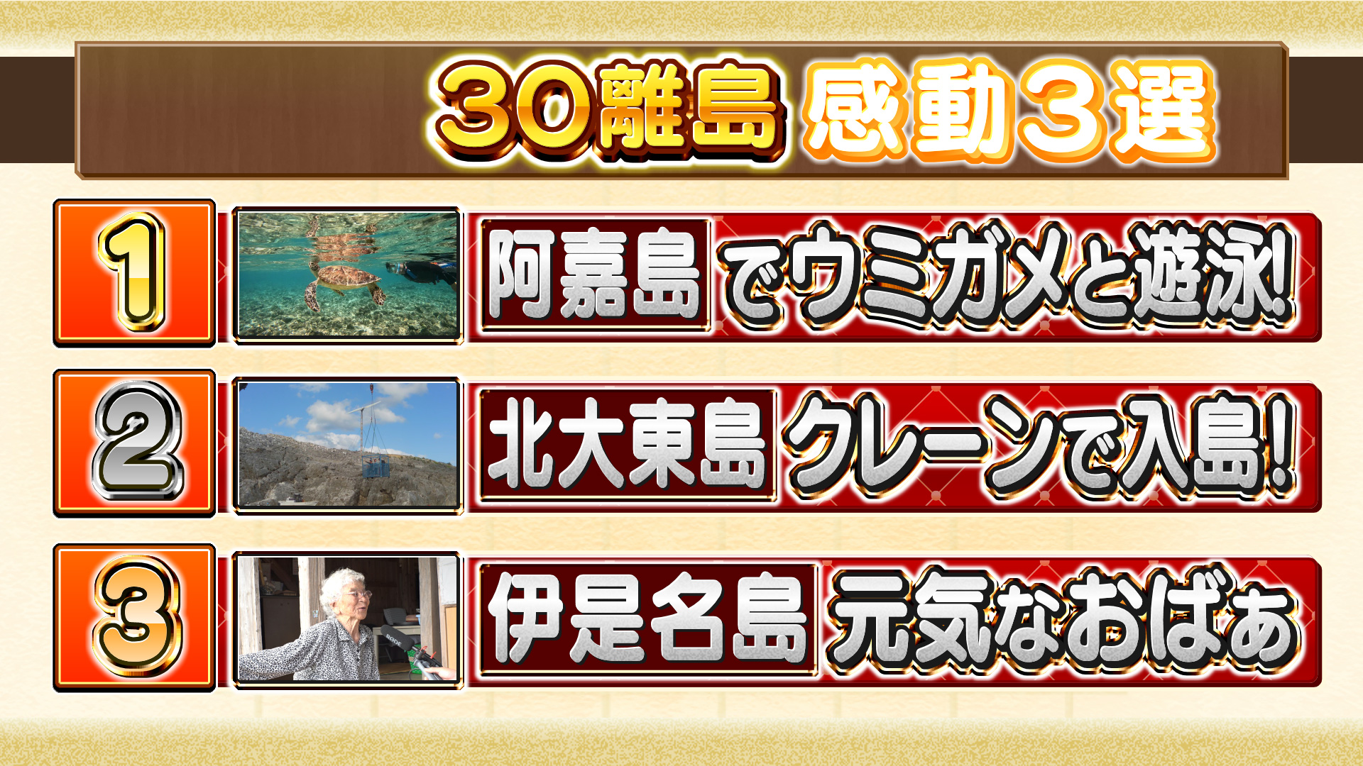 2025年10月1日放送 30離島再発見!! トレジャーアイランド 番外編 企画が立ち上がった当初は、戸田さんが30離島を巡るという企画でしたが、夏の甲子園の取材等で離島ロケに行けない時があり、その時に、急遽、仲本さんだったり、知念ださんにもロケに行ってもらうことになりました。 それぞれのリポーターが行った島は、戸田アナが23島、仲本さんが3島、知念ださんが3島となりました。 戸田アナの「30離島!離島感動3選」、仲本新さんの「30離島!ビックリ事件!」をご覧ください。