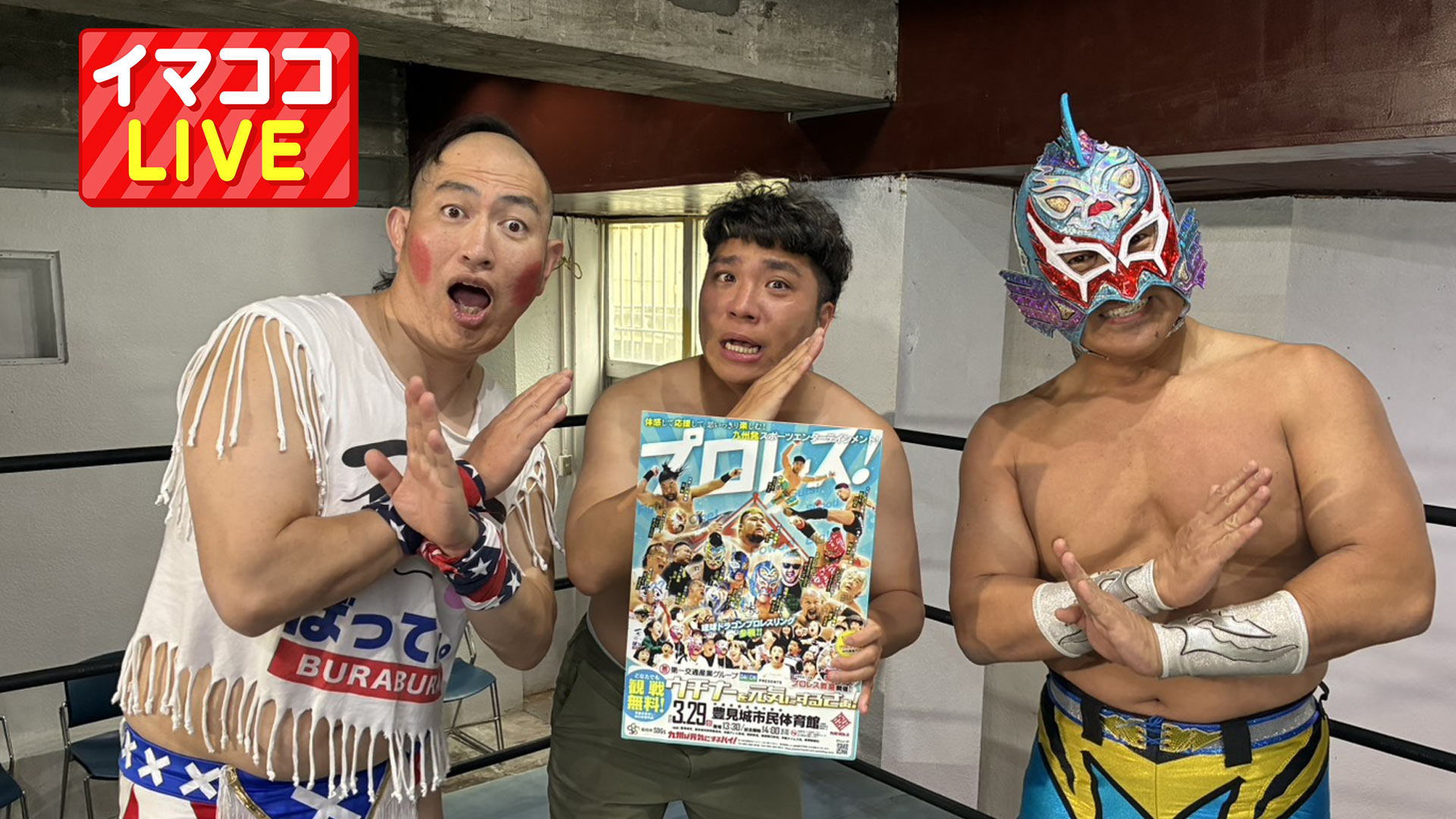 九州プロレス沖縄大会「ウチナーを元気にするさぁ!」 2026年3月27日 Last updated : 2026年3月27日 webmaster きょうは沖縄市にあります琉球ドラゴンプロレスリングの道場からお伝えします。今度の日曜日、豊見城市で九州と沖縄のプロレスが激突、というか、大合体するんです! 「ウチナーを元気にするさぁ!」九州プロレス沖縄大会は3月29日(日)豊見城市民体育館にて13:30開場、14:00試合開始。そして一番驚きなのが「観戦無料」なんです! 沖縄大会ならではの、ここでしか見られない特別カードが目白押しです。お見逃しなく! 九州プロレス沖縄大会「ウチナーを元気にするさぁ!」 / MAP