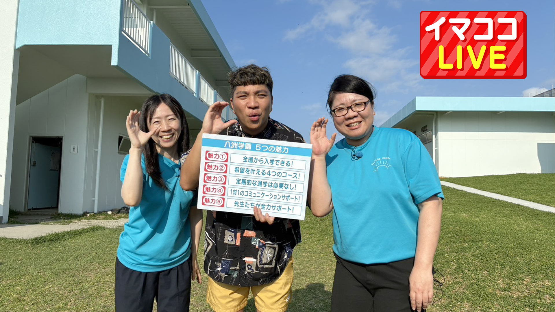 八洲学園大学国際高等学校 2026年4月16日 Last updated : 2026年4月16日 webmaster きょうは本部町にある「八洲学園大学国際高等学校」に来ています!海が見えて最高のロケーションです。 ただいま令和8年度4月入学生を募集中です。高校入学・転校・再入学を希望される方に向けた入学個別相談会も県内各地で行っていますので気軽にご相談ください。 八洲学園大学国際高等学校 / MAP