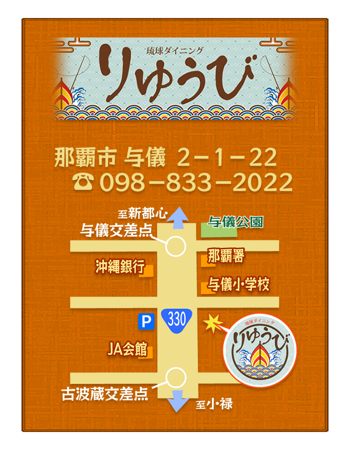 久茂地の店舗老朽化の為昨年6月に移転!与儀に新店舗「琉球ダイニングりゅうび」として復活!元祖ソーキの網焼きも完全復活! 元祖ソーキの網焼き ¥1,800〜 琉美豚のおろしわさびポン酢 ¥780 炙りラフテーチャーハン ¥780 海ブドウと島豆腐サラダ(夏季限定) ¥680 ウチナー風ポーポーアイス ¥450 営業時間 月〜木 18:00〜1:00 金・土 18:00〜2:00 定休日 日曜日 住 所 那覇市与儀2-1-22 TEL 098-833-2022 ジャケット ONE STEP ¥29,000 シャツ ONE STEP ¥19,000 パンツ ONE STEP ¥22,000 ピアス ERICK ET LYDIE ¥7,000