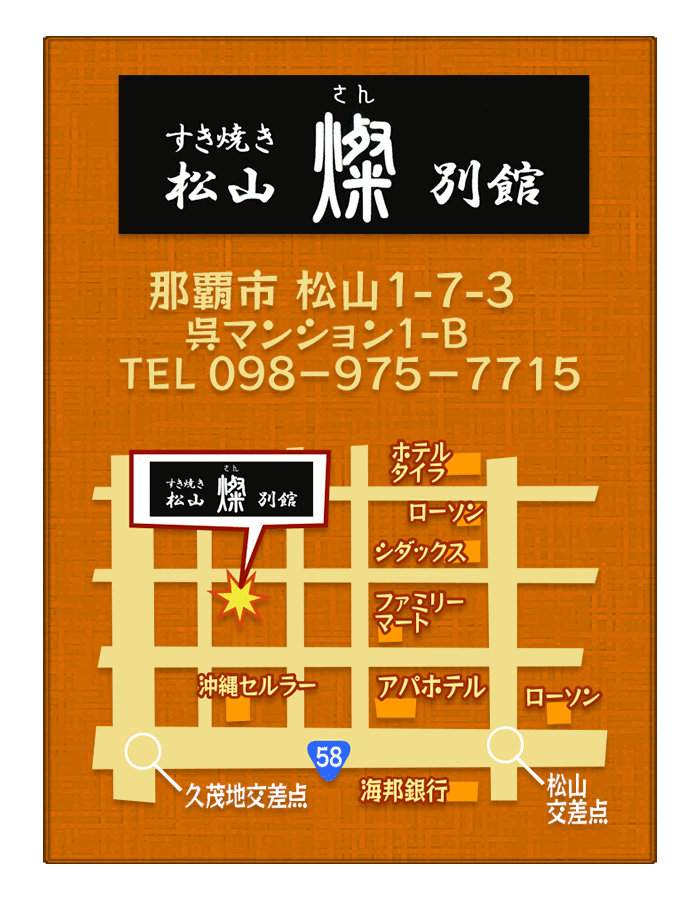 県産和牛のすき焼きやしゃぶしゃぶを上質な空間でお楽しみください。 県産和牛 すき焼き・しゃぶしゃぶ ¥5,000(税込)〜 県産和牛 牛タン しゃぶしゃぶ ¥4,800(税込) 県産島豚しゃぶしゃぶ・すき焼き ¥3,000(税込) 県産地鶏 すき焼 ¥4,500(税込) 鳥のしんじょ揚げ ¥800(税込) ランチ営業 11:30〜15:00 スタミナ丼 ¥800 すき焼しゃぶしゃぶ¥1,200 営業時間 18:00〜24:00 日・祝18:00〜23:00 定休日 不定休 住 所 那覇市松山1-7-3 呉マンション1F TEL 098-975-7715