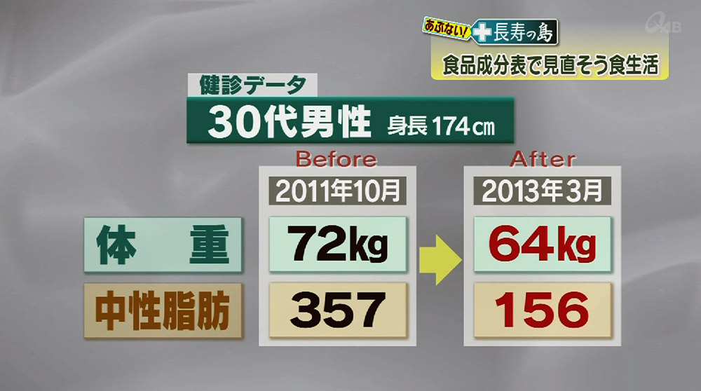 実際にこの成分表をもとに、具志堅さんが栄養指導を行った男性の検診データです。こちらが指導前。身長174㎝。体重が72㎏、150までが正常値とされる中性脂肪が357かなり高いですね。