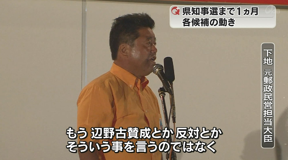 辺野古への基地建設をめぐり、埋め立ての「承認撤回」を掲げる候補者が必要と訴えるのは喜納前民主党県連代表。