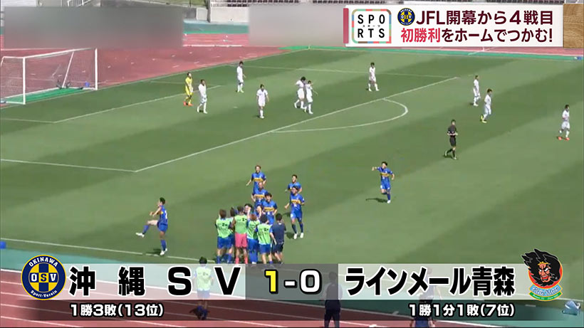 青のユニフォーム沖縄SVはホームゲーム。開幕3連敗で迎えたきのうの4戦目は0-0からの後半、コーナーキックからのボールがこぼれたところ小田島怜(おだじま りょう)が蹴りこんで得点。結果この1点を守り切ったSVがうれしいJFL初勝利を上げました。