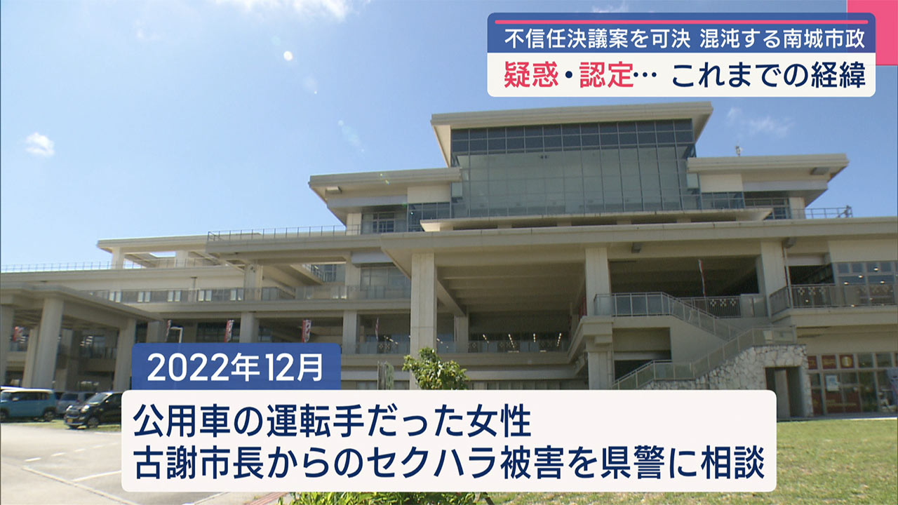 ことの発端は、2022年12月、公用車の運転手だった女性が、古謝市長からのセクハラ被害を受けたとして県警に相談したことでした。