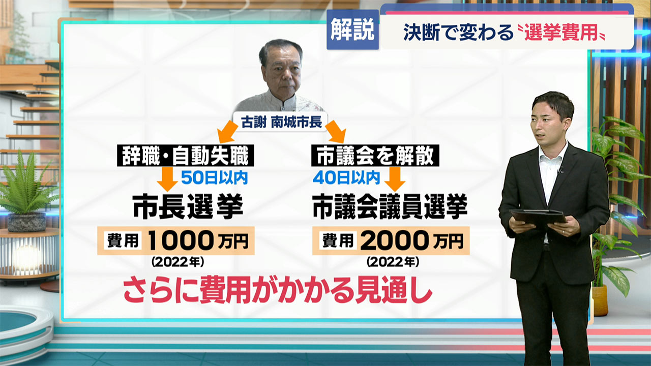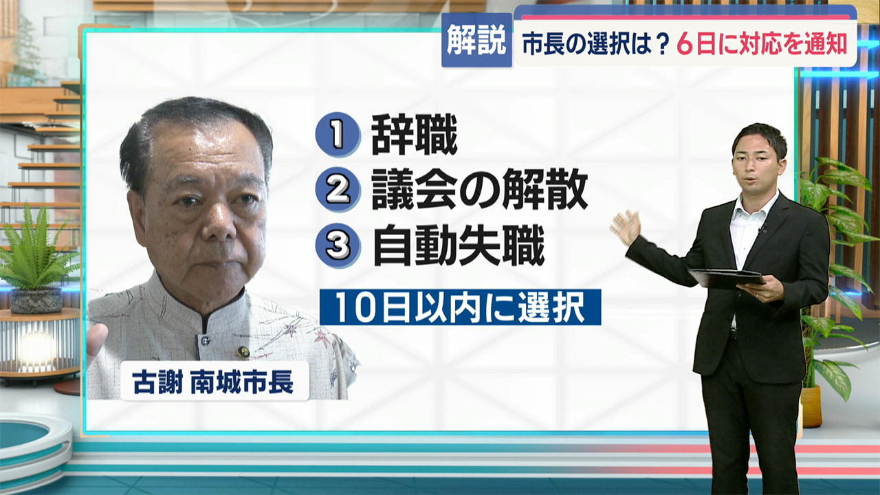 濱元記者「はい、市議会から不信任決議を受けたことで古謝市長は、来週6日までに『辞職・自動失職・議会解散』の3つの選択肢のうち、一つを選ぶことになります」