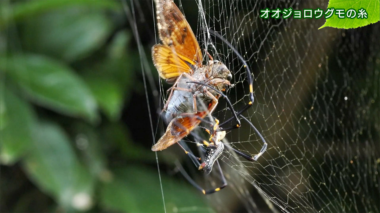 湊 和雄さん「まず、網に掛かった段階から観察してみましょう。リュウキュウアブラゼミは網から逃れようとかなり暴れていますね。暴れるリュウキュウアブラゼミに近づいて糸を掛けていますね。このとき使われいる糸に注目してください。細い糸が束になっていますね」