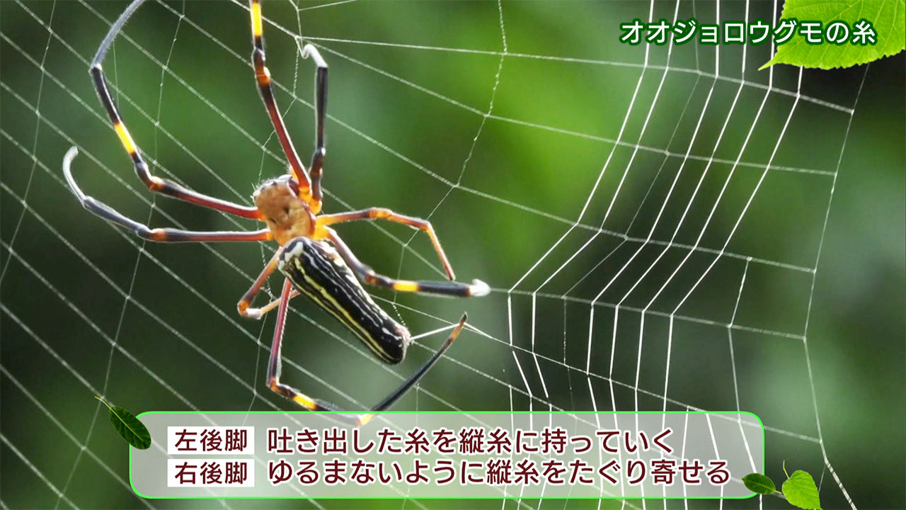 湊 和雄さん「1本の糸より結束効果があるのでしょうね。リュウキュウアブラゼミはかなり暴れましたから、網も破れました、その補修が始まりました」「このときの糸は太めの1本に見えます。横糸を縦糸の間に張っていますが、左右の後脚を使い分けていますね、吐き出した糸を縦糸に持っていくのは左後脚。弛まないように縦糸を手繰り寄せるのは右後脚です。
