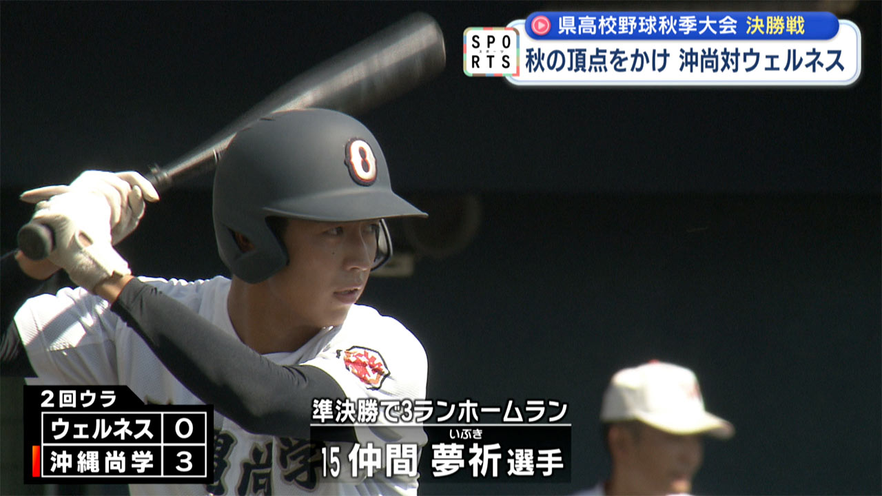 そして迎えた、きのうの決勝戦。沖縄尚学と日本ウェルネス、ともにスタンドからの熱い応援を受ける中、1点を先制した沖尚が2回、足立琥太郎(こたろう)の2点タイムリーで追加点を奪います。