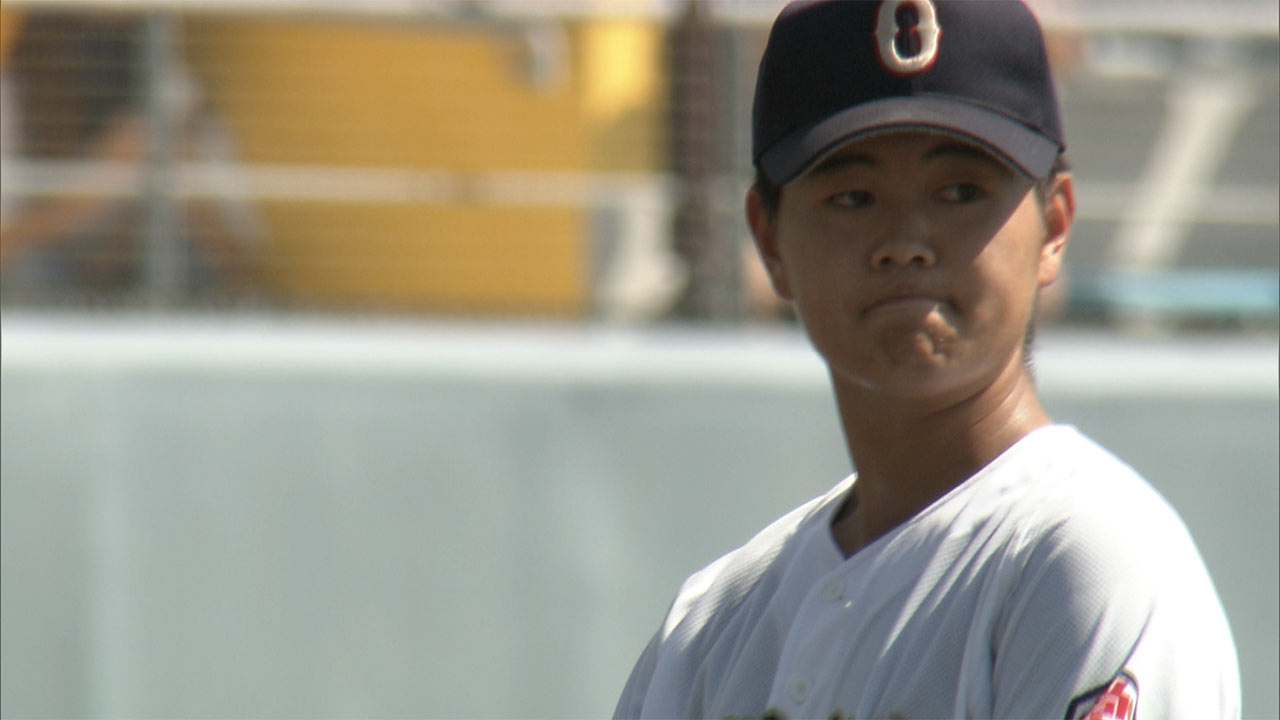 今年夏の沖縄大会決勝と同じカード、エナジックスポーツと沖縄尚学が激突した準決勝、沖尚の先発は末吉良丞。沖縄大会決勝でも先発し、9回を投げわずか1失点とエナジック打線を封じました。代替わりして相対したこの試合でも末吉はランナーこそ背負いますが得点は与えません。