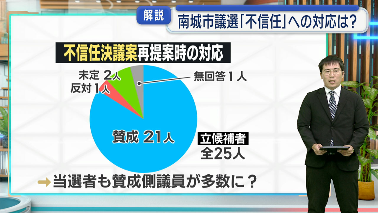 塚崎記者「はい。不信任決議案への対応についてQABなどが立候補者に聞いたところ、賛成は全25人中、21人でした。一方、反対を表明したのは1人、未定は2人、1人は無回答でした。議会は定数が20人なので、賛成以外の立場の人が全員当選しても、賛成側の議員が過半数を占める公算が大きくなっています」