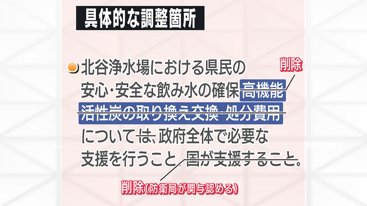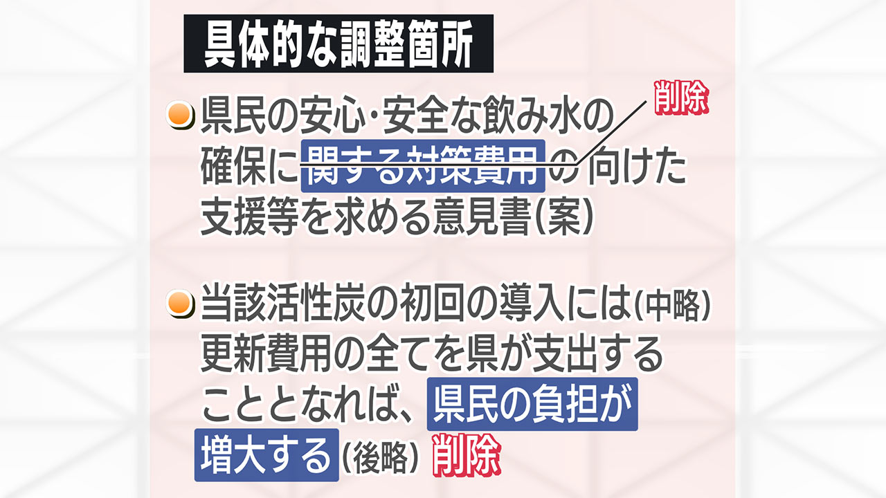 塚崎記者「また、要請項目の部分で国側に求めるものが『高機能活性炭の取り換え交換・処分費用』という部分が『県民の安心・安全な飲み水の確保』という表現になっています」