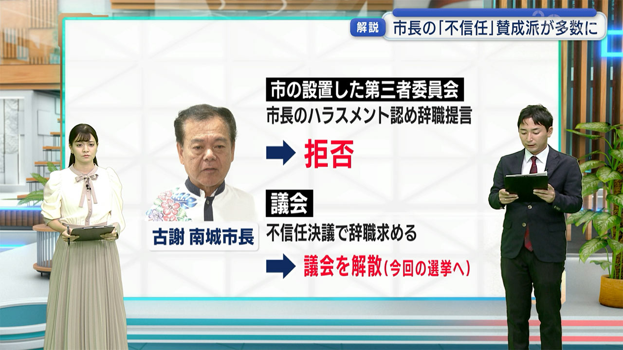 濱元記者「ことの発端は、古謝景春市長自身のセクハラ疑惑など一連の問題です。この問題を調査していた第三者委員会は、市長のハラスメント行為を認め、辞職を提言しましたが、市長はそれを拒否。議会は、不信任案を可決し辞職を迫りましたが、市長が議会を解散をしたため、今回の選挙が行われました。まさに『市長の続投を認めるか否か』それだけを問う選挙になってしまいました」