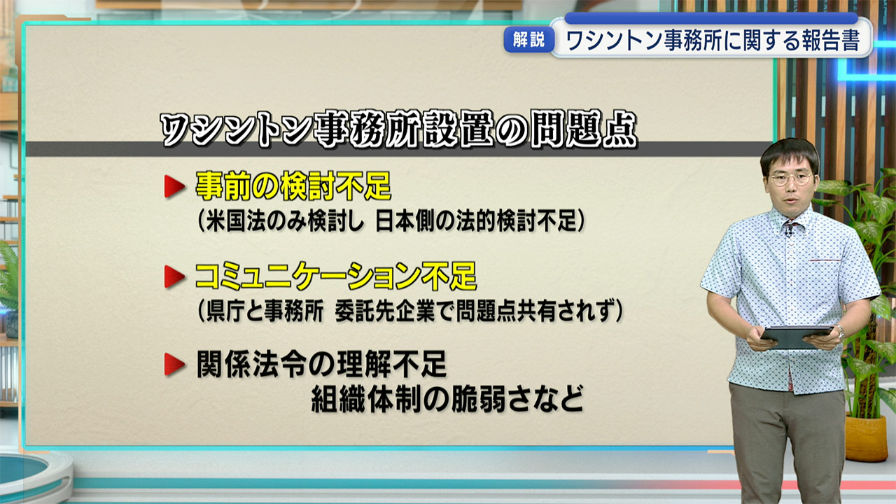 塚崎記者「事務所設立の経緯についてまとめた今回の報告書では、アメリカ側の法律をクリアすることに集中して、日本側の法律をクリアすることの検討が不足していた点や、県庁とワシントン事務所、委託先の企業などとのコミュニケーション不足が重なったことなどを挙げていました」