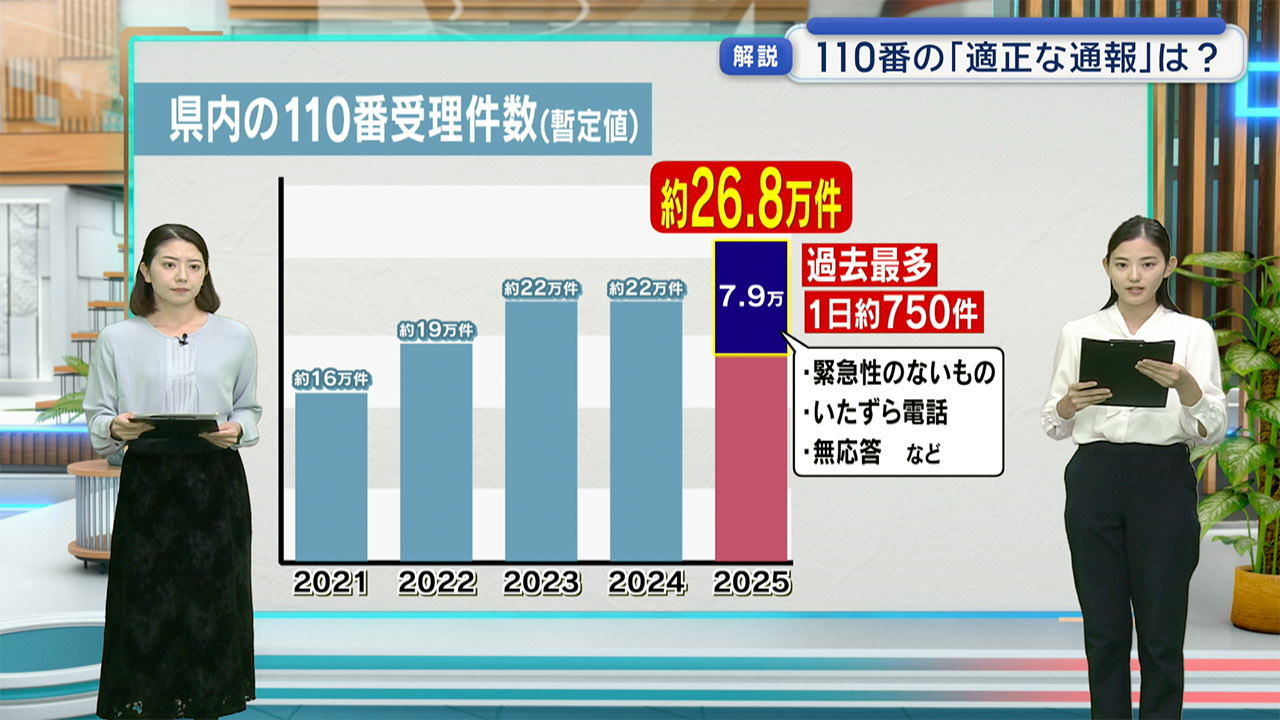 本村記者「県警によりますと、110番の受理件数は年々、増加傾向にあり去年はおよそ26万8000千件(暫定値)で過去最多となりました。1日あたりだと、およそ750件となっています」