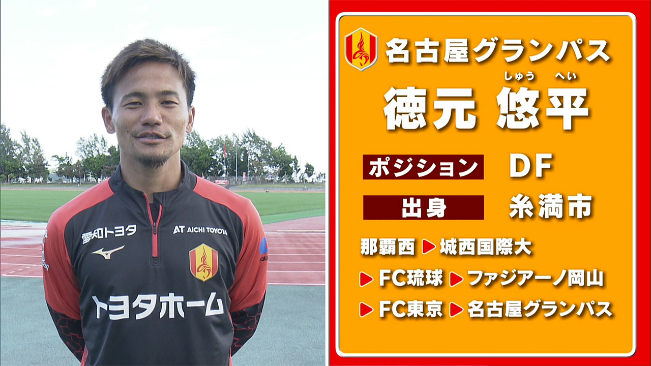 徳元悠平選手「名古屋グランパス55番の徳元悠平です。糸満市出身です」「常に明るく僕から繰り出される左足のキックを見てください」