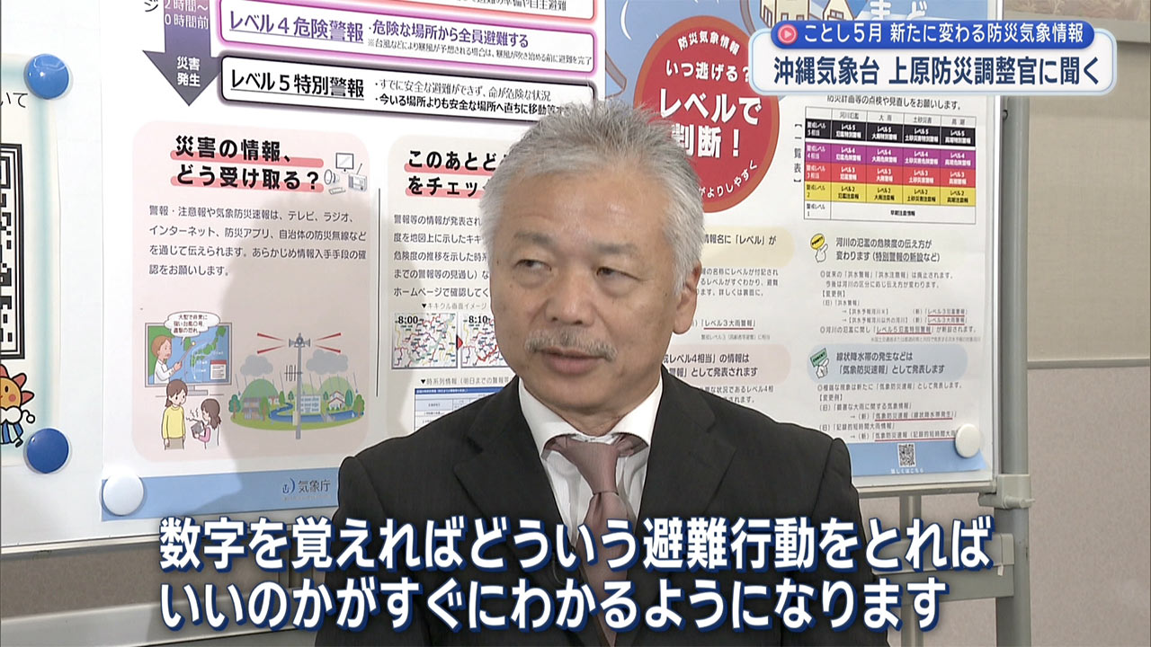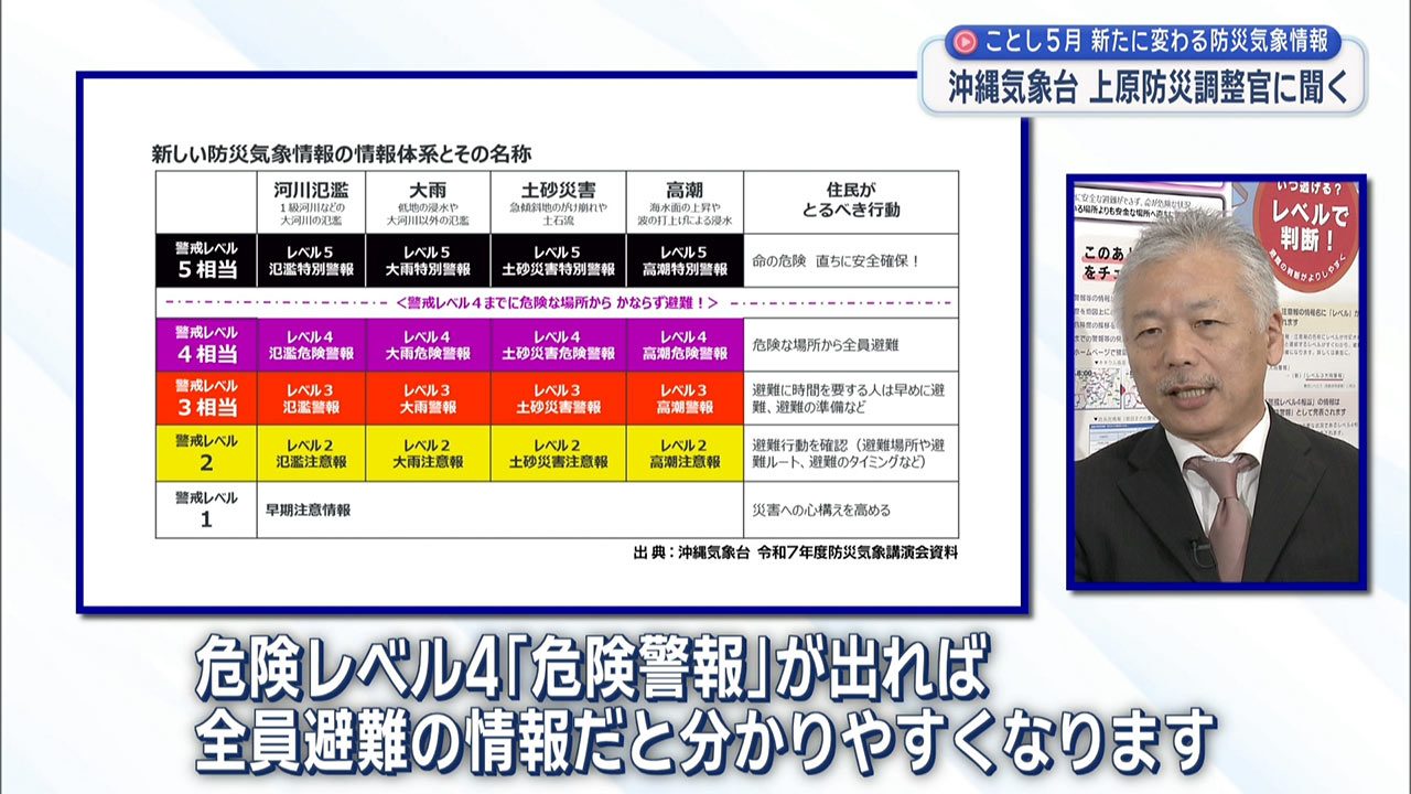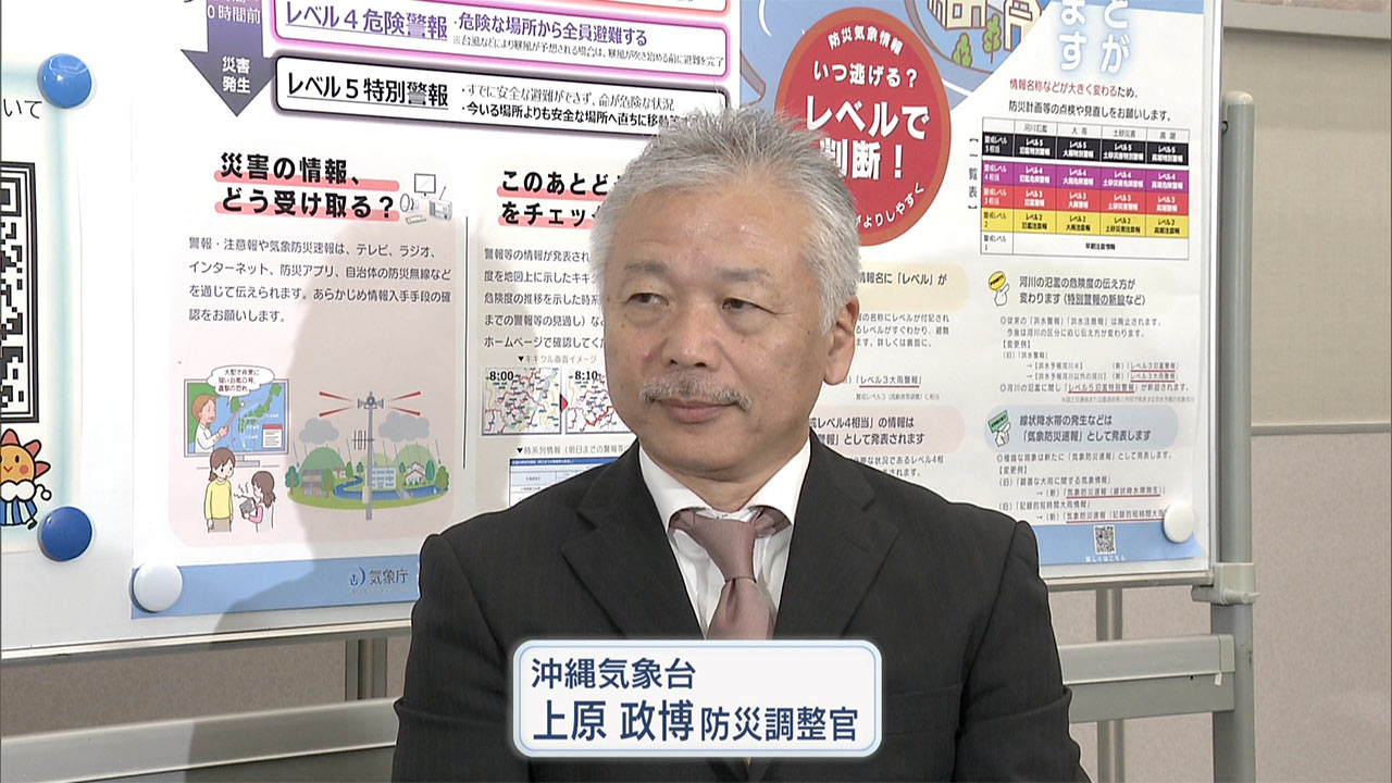 池宮城さん「このアンケートによると、およそ半数の方が『情報の種類が多すぎてわからない』『どれが避難を判断するのに参考となる情報なのかが分かりにくい』と答えています。このような経緯もあり、令和4年から有識者による検討会が開かれ、今回の見直しにつながったとのことでした。この新たな防災気象情報について、講演会で登壇された沖縄気象台の上原防災調整官にお話を聞きました」