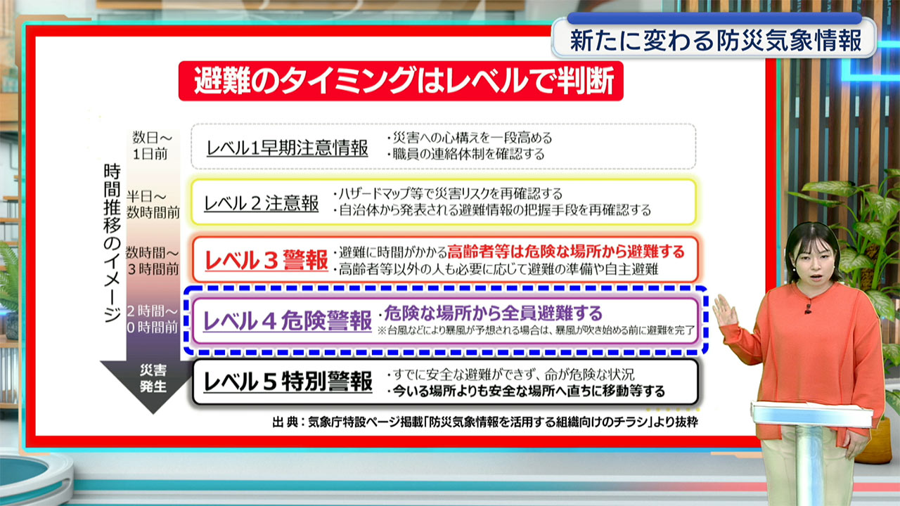 「これまで例えば土砂の情報でしたら土砂災害警戒情報などの名前になっているんですが、これが全てレベル4は例えば氾濫とか土砂とか、大雨とか、高潮とかですね、全てがこの危険警報という名前で統一されます。危険レベル4、危険警報というのが出れば全員避難の情報だというのが分かりやすくなります」