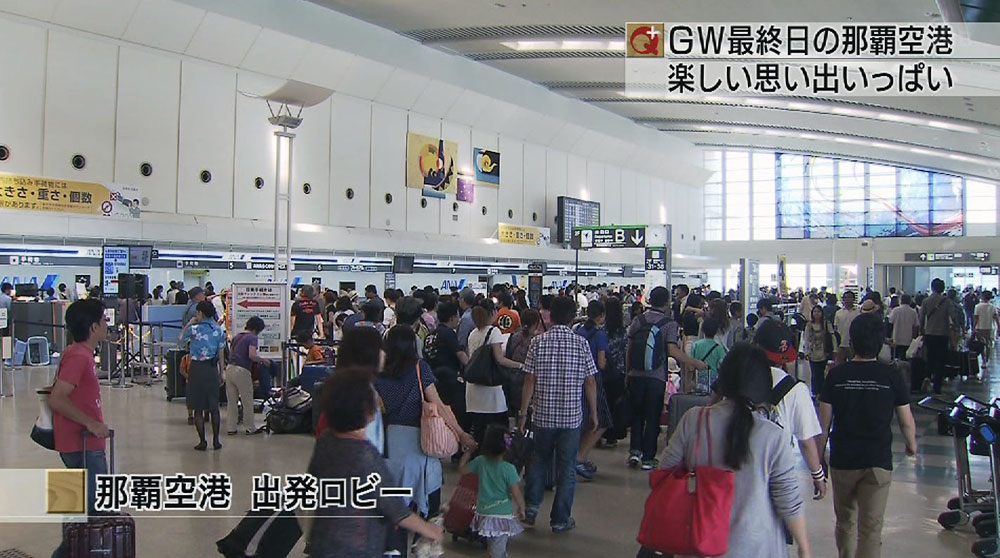 ゴールデンウィークも5月6日が最終日となり、那覇空港では、沖縄で連休を楽しんだ人たちで混雑しています。 「時刻は午前9時です。カウンターには出発を待つ人たちが大勢詰めかけていて、その列は、ロビーの中央…