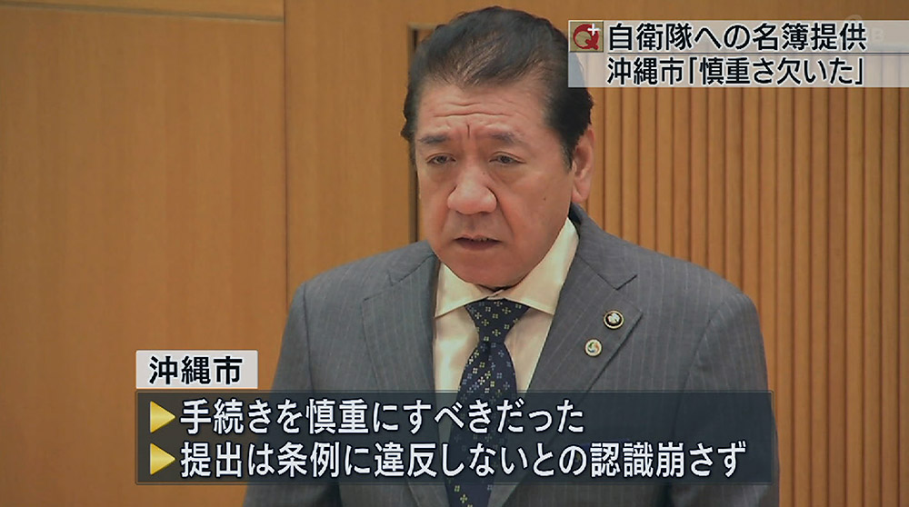 沖縄市と宜野湾市が、2015年5月、自衛隊に市民2万4000人分の名簿を提供した問題で、沖縄市は12月17日手続きに慎重さを欠いていたとして謝罪しました。 沖縄市議会で仲本兼明副市長は「慎重な対応が必…