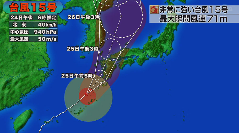 非常に強い台風15号は、勢力を維持したまま、22日以降、八重山地方に近づきそうです。早めの台風対策が必要です。非常に強い台風15号は、午後3時現在、フィリピンの東の海上にあって、西北西に進んでいます。…