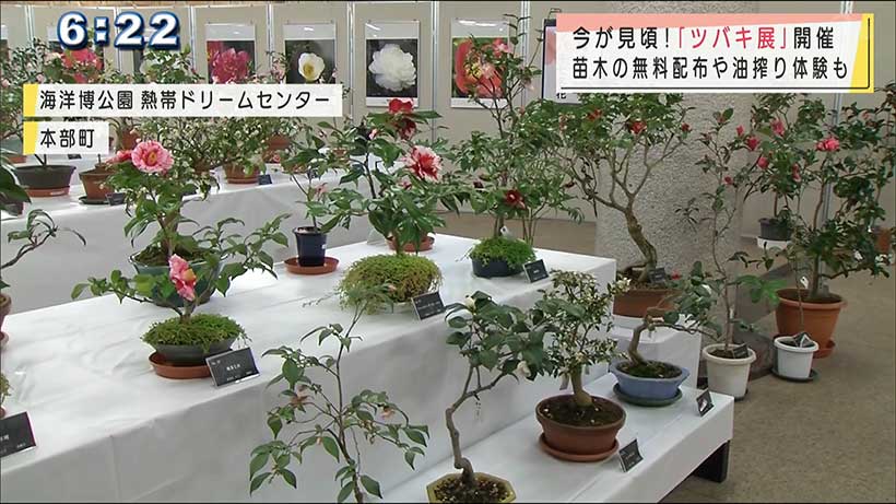 本部町の海洋博公園ではこの時期に見ごろを迎える色とりどりのツバキの展示が始まりました。 2021年2月11日から行われているツバキの展示では、沖縄椿協会の協力を得て県内の愛好家などが丹精を込めてつ…