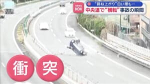しかし、後ろを走る車がタイヤに乗り上げて大きく蛇行。中央分離帯に衝突しました。煙のようなものも見えます。