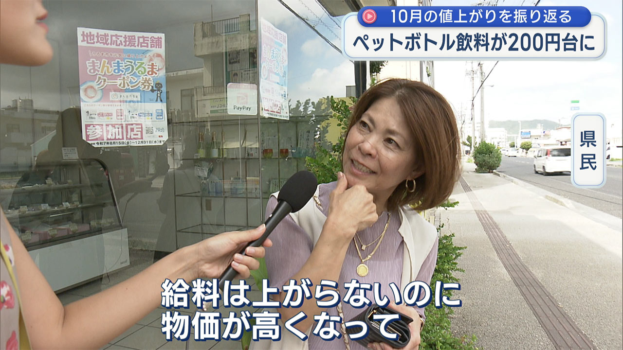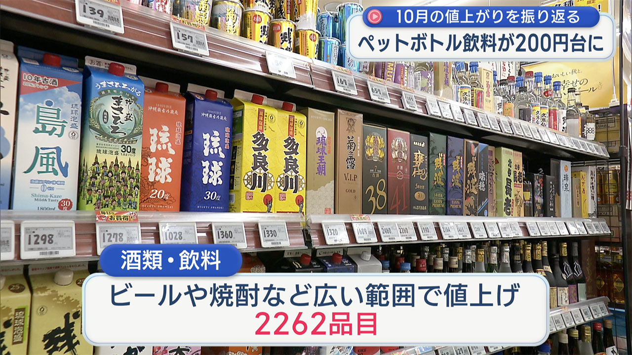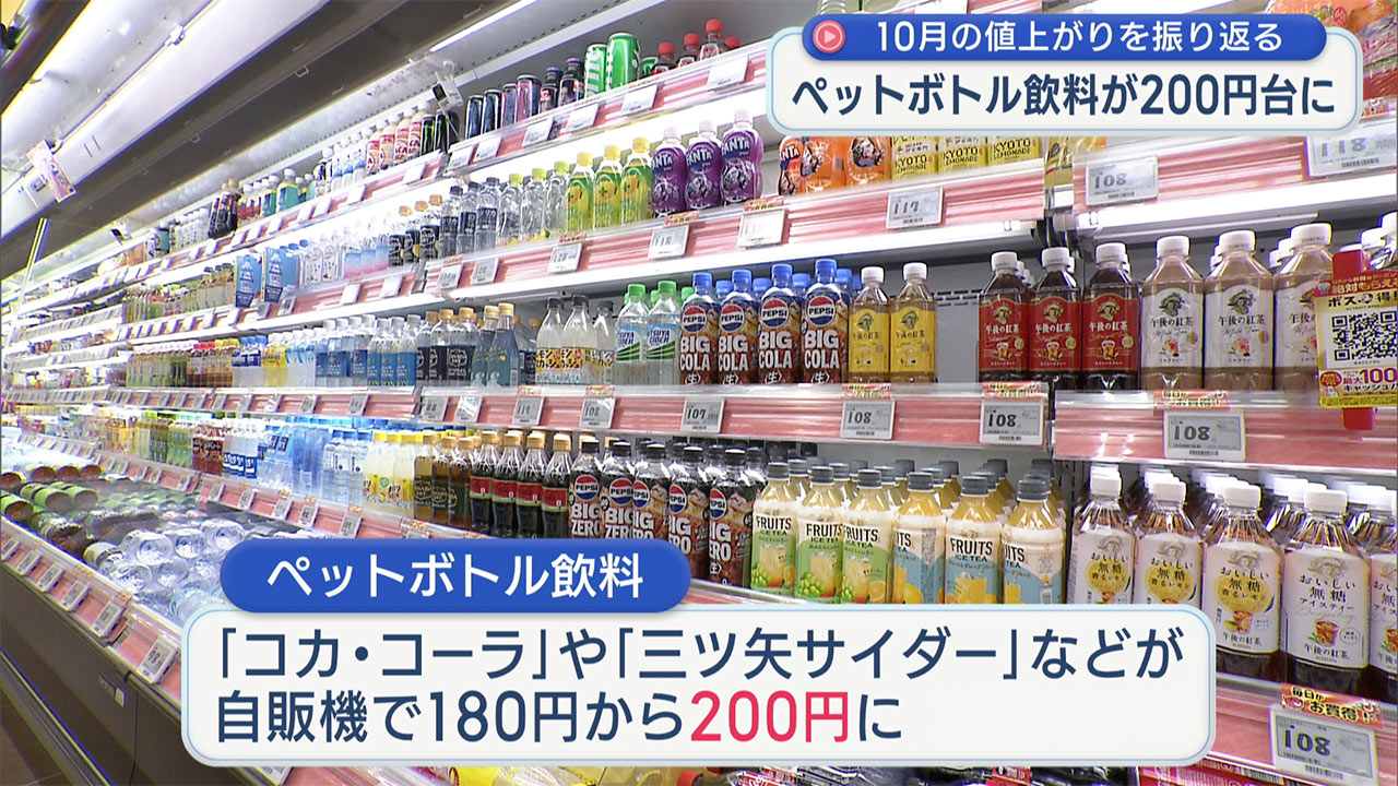 ビールや焼酎・ワインといった洋酒など広い範囲で値上げされ、前の年と比べると8割を越える飲料で値が上がっています。おなじみのペットボトル飲料も今月から「コカ・コーラ」や「三ツ矢サイダー」そして「お~いお茶」などが500ミリリットルや600ミリリットルで自販機では180円から200円となりました。ペットボトル飲料は今や200円の大台に乗っているのです。