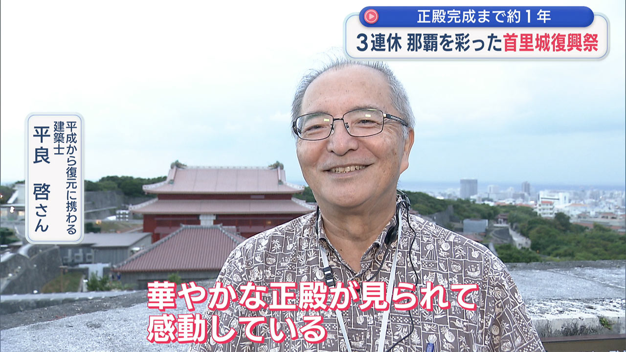 平成から首里城の復元に携わる建築士平良啓さん「亡くなられた方が多くて(復元に携わった)先輩方。あの人たちの努力の上に我々が乗っかっている感じじゃないかな。今は外観のみだが華やかな正殿が見られて感動している」