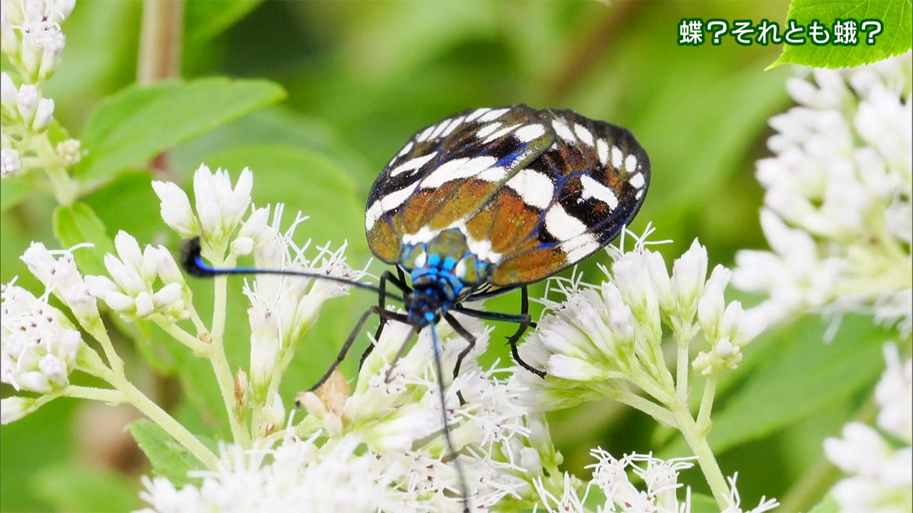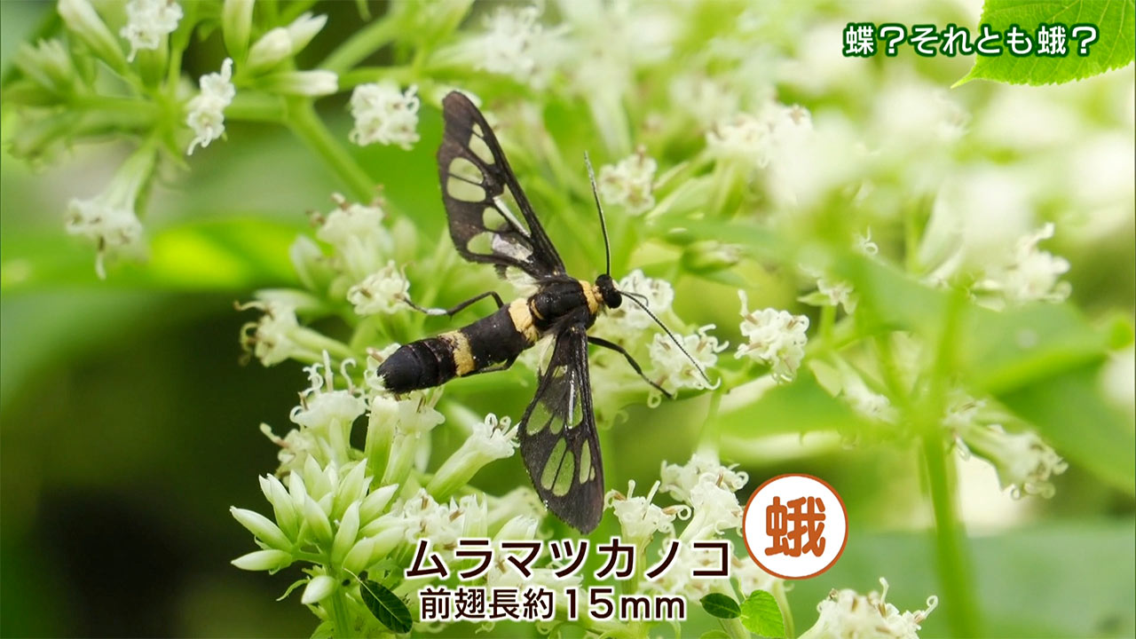 湊 和雄さん「これはムラマツカノコ。翅に透明な部分も多く、ハチに似ています。ハチは毒針で刺しますから、鳥などの天敵にも恐れられています。それに擬態した作戦なのです」