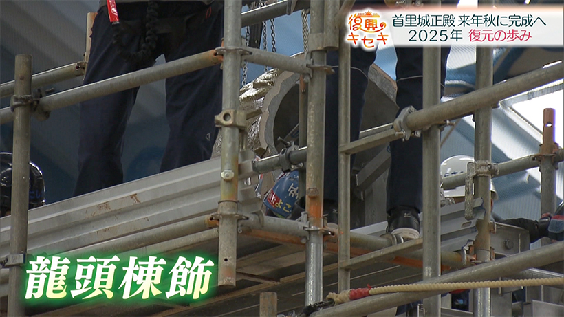 船越 記者「正殿の屋根を飾る龍頭棟飾の一部が今取り付けられようとしています」