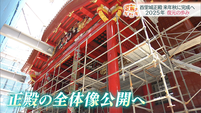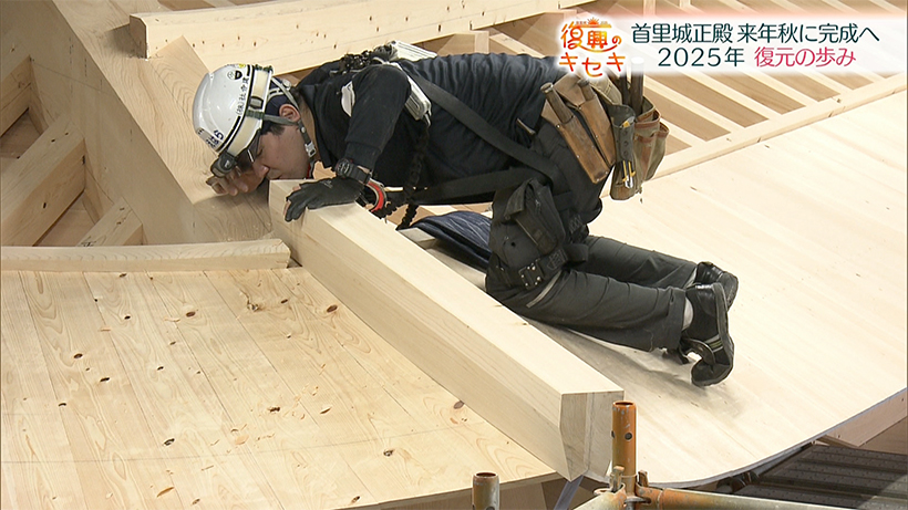 玉城アナウンサー「来年秋の正殿完成へ、集大成となる2026年にはどんな作業が予定されているか、見ていきます」