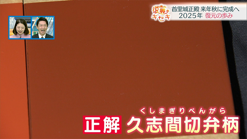 玉城アナウンサー「(中村アナ答える)正解は――久志間切弁柄。現在の名護市久志地域などで採れた「鉄バクテリア由来」の天然顔料です。古文書に記載はあったもの、どこで採れた何を原料に生産されていたのか平成の復元時には特定できませんでした。しかし今回、関係者の努力で、再現することができました。太陽の下だと肉眼でもかなり分かる。ぜひ注目してみてください」