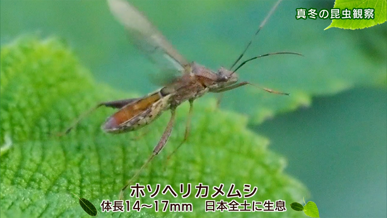 湊 和雄さん「意外かもしれませんが、カメムシの仲間たちが目につきます。ホソヘリカメムシ。和名でもある細長い体型が特徴です。これはハチに擬態していると言われます。特に翅を開いて飛ぶ姿が」
