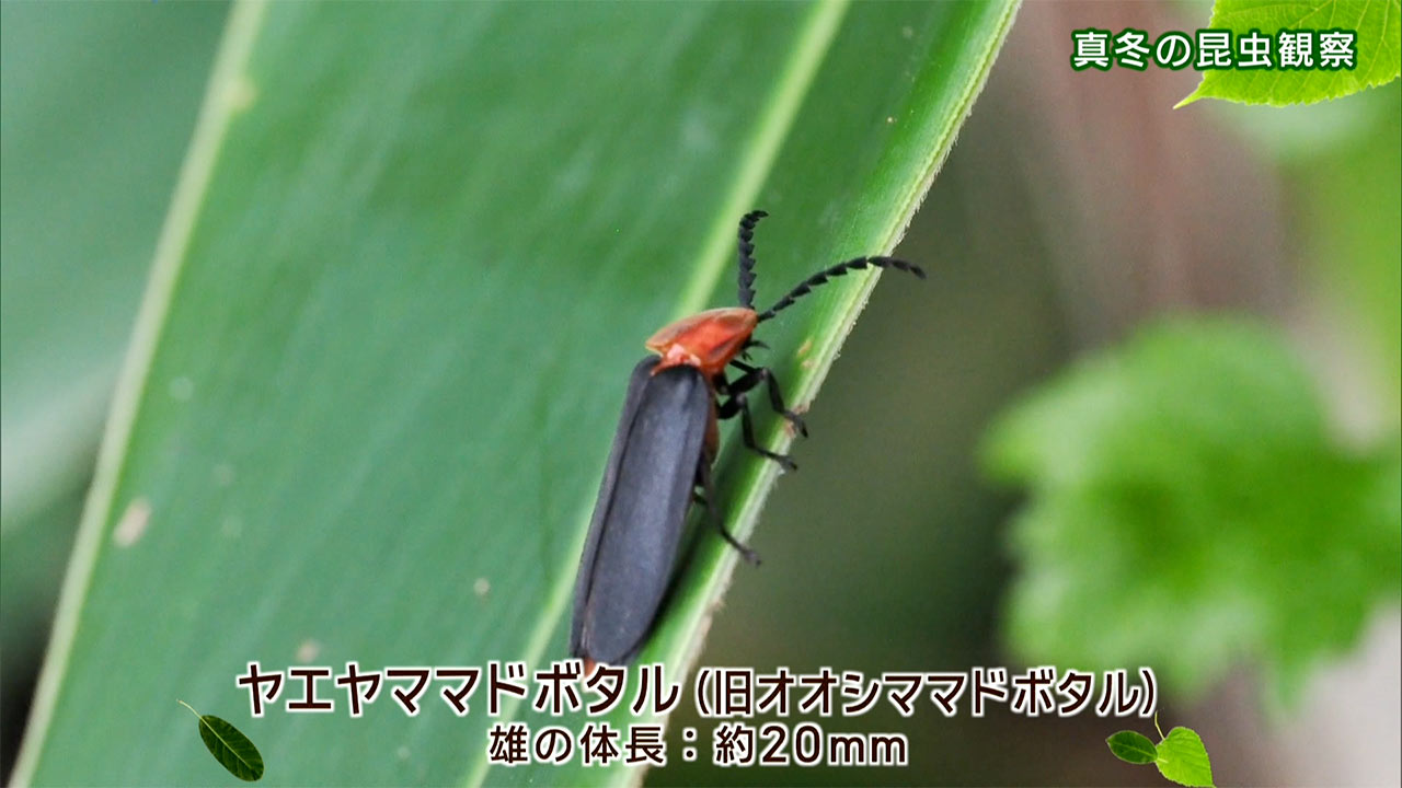 湊 和雄さん「次は甲虫です。しかも、夏のイメージの強いホタルです。さらに日本最大級のホタル。雄の体長は約20mm。かつてオオシママドボタルと呼ばれていたヤエヤママドボタル。本来の生息地は八重山諸島ですが、2003年に沖縄本島南部で見つかり、今では本島全域で見られます。恐らく建築資材に紛れて持ち込まれたのだろうと考えられています。10月から1月が成虫の活動期です」