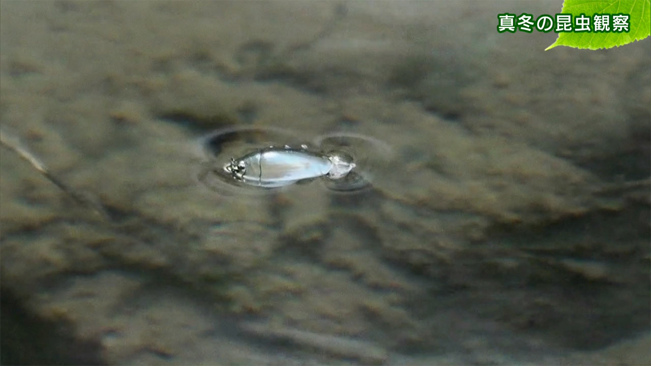 湊 和雄さん「次の舞台は渓流環境。亜熱帯とは言え、冬の渓流は冷たいですね。しかし、活動している昆虫がいます。しかも複数。これはアマミアメンボ、しかもペアですね」