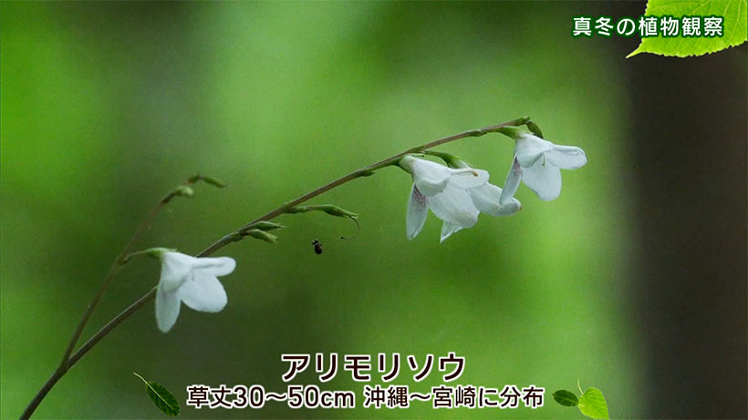 湊 和雄さん「やんばるの冬の花で忘れてならないのが、このヘツカリンドウ。一株、一株花の模様・色が異なるのが大きな特徴ですね。白、紫、黄緑色が基本ですが、花(株)によって、その比率が異なります。この黄緑色の部分は蜜線といって蜜を分泌してアリなどの小さな昆虫を誘引する器官なのですが、この日は見られませんでした」