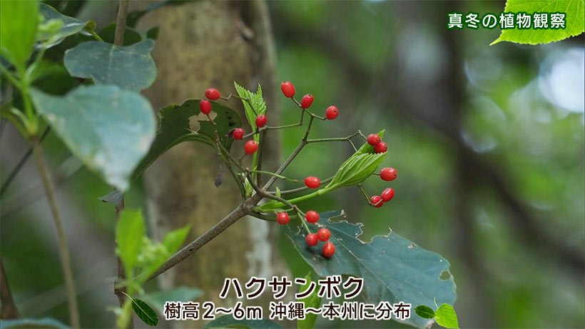 湊 和雄さん「まずは冬の花を見ていきましょう。ツバキの花というと、温帯の本土のイメージが強いかもしれませんが、やんばるの森にも野生のヤブツバキの花が見られます。それも、真冬の今頃なんです」