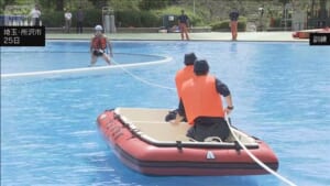 西武園ゆうえんちで水害訓練 流れるプールを川に見立て救助の練習