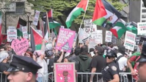 国連本部近くで反イスラエルデモ 「トランプは戦争犯罪人のくせに徴兵逃れ」